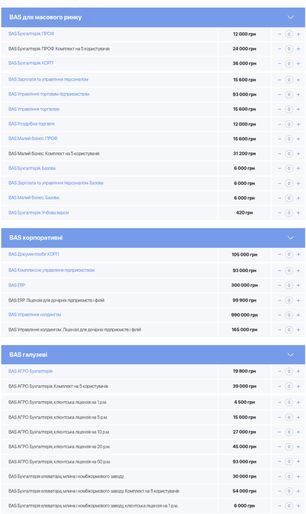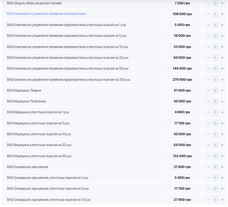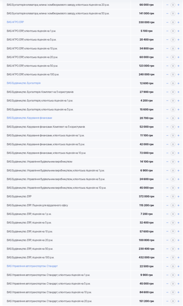 На наданих мені скриншотах видно публічні прайси дилера: BAS ERP, BAS Документообіг КОРП, BAS Управління холдингом, BAS Бухгалтерія, BAS для торгівлі, BAS для агро, будівництва, медицини, громадського харчування. Не “десь у тіні”, не “на закритих форумах”, не “через сірі канали”, а відкрито, публічно, з цінами, ліцензіями, клієнтськими місцями, розширеннями. І це на тлі того, що у 2026 році Держспецзв’язку оприлюднила перелік забороненого до використання ПЗ, куди прямо включені 1С, BAS і UA-Бюджет.