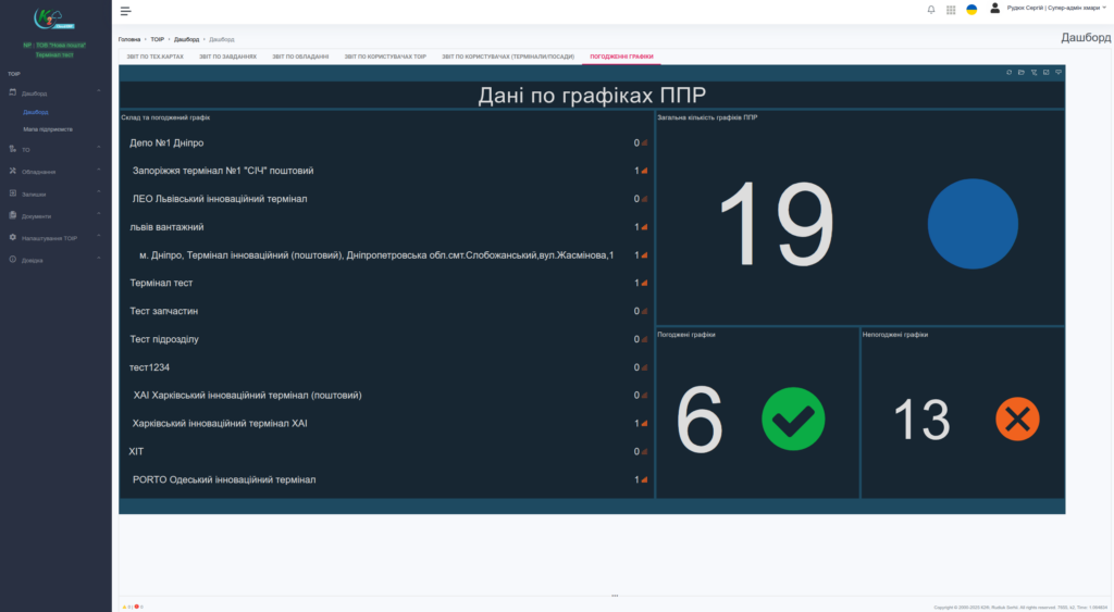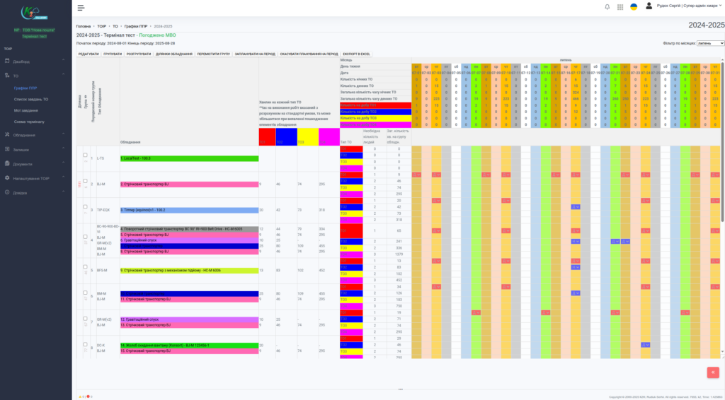 - Графіки ППР (планово-попереджувальних робіт) з кольоровим відображенням активностей.
