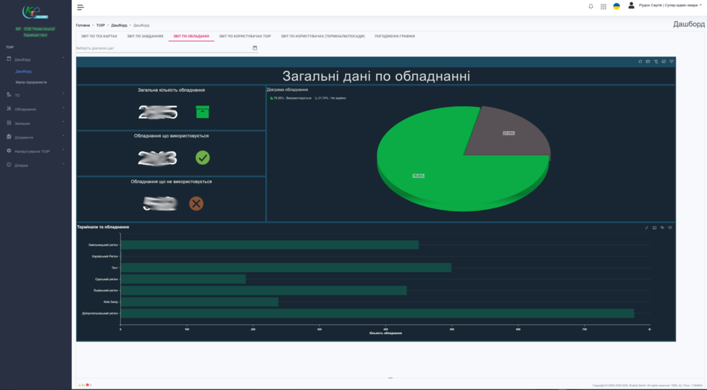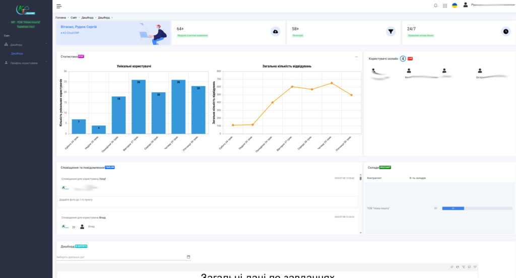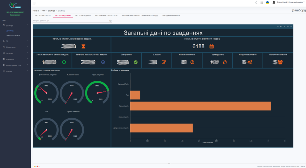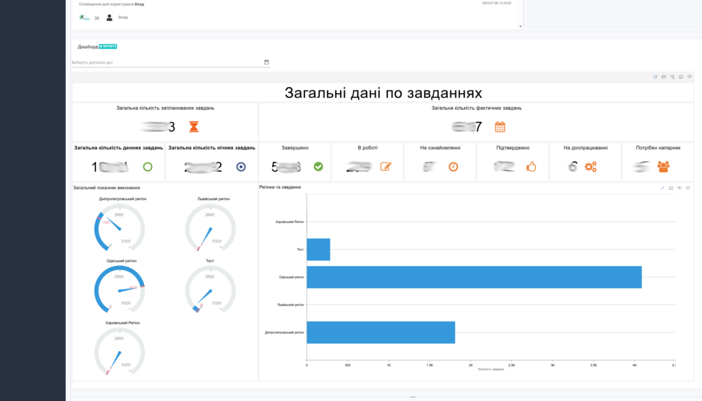 - Дашборди з ключовими метриками: кількість завдань, статуси, регіони, завантаженість персоналу, KPI.